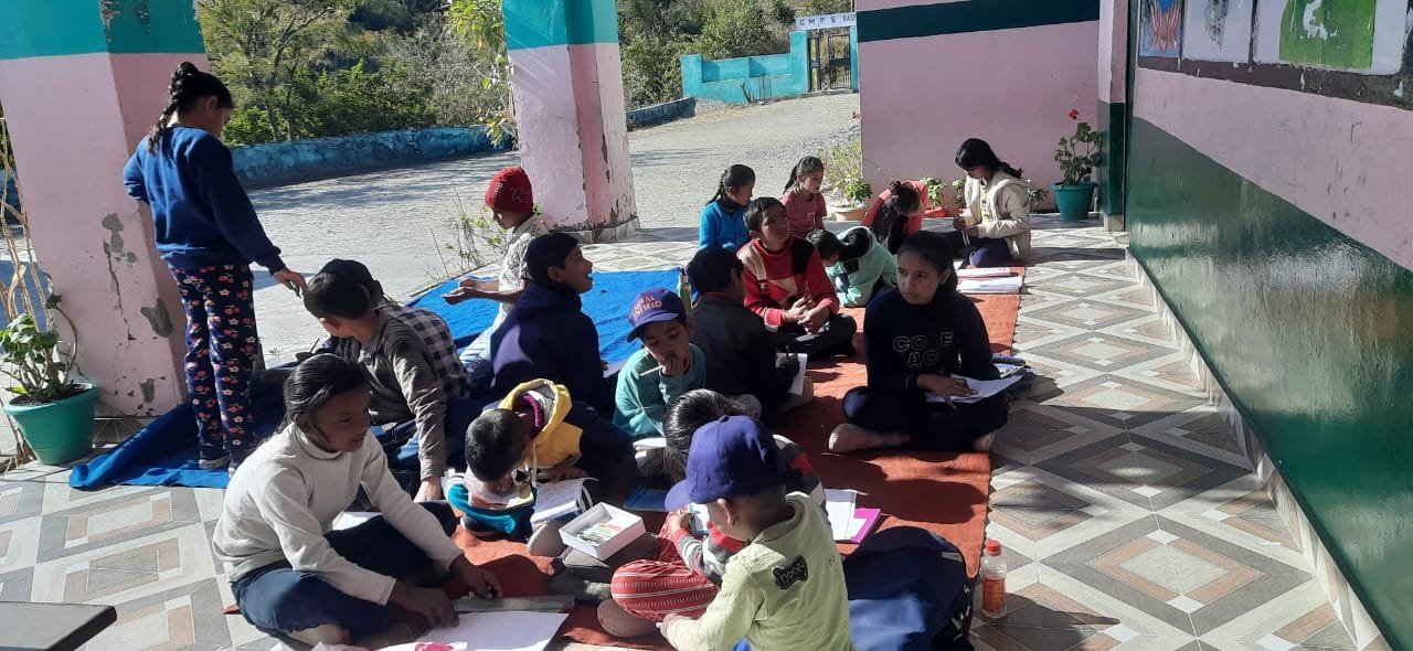 राजकीय आदर्श प्राथमिक विद्यालय -बासोट, क्षेत्र – भिकियासैंण(अल्मोड़ा) में प्रारंभिक स्तर के बच्चों का पाँच दिवसीय शीतकालीन कार्यशाला(विंटर कैम्प) का आज तीसरा दिन है। आज बच्चों ने विविध खेल गतिविधियों जैसे कबड्डी और मानसिक खेल में भाग लिया। मानसिक खेल के अंतर्गत ” घोड़ा है जो मालसाई, पीछे देखो मालसाई ” और गोल घेरा बनाकर जोड़ा बनाने की अवधारणा सीखी । इसकेबाद बच्चों को कुछ शब्द शेर, हाथी, जंगल, हरे पौधे, खरगोश ,हरी घास, नदी, पानी आदि देकर चित्रों के साथ एक कहानी बनाने के लिए दी गई ।