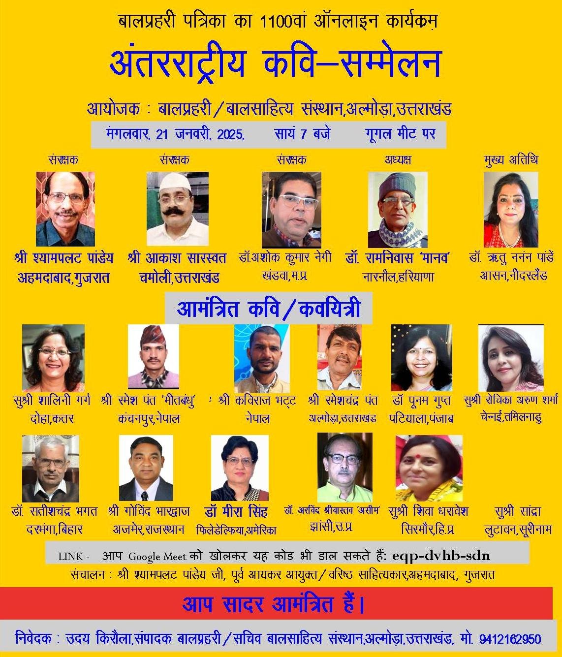 बाल प्रहरी द्वारा आज किया जाएगा ऑनलाइन अंतरराष्ट्रीय कवि सम्मेलन
