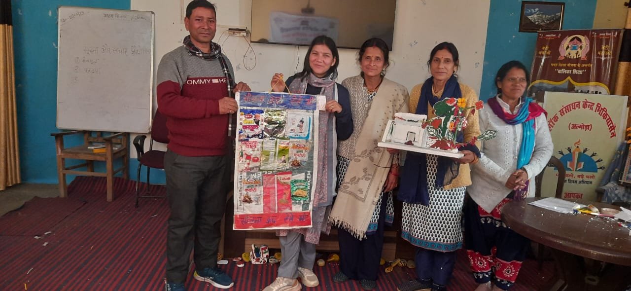 द्वितीय सत्र में सन्दर्भदाता कृपाल सिंह शीला द्वारा खेल खिलौने अधिगम सामग्री का निर्माण, अनुपयोगी व निष्प्रयोजन वस्तुओं से खेल खिलौना निर्माण के तहत कठपुतली निर्माण व खाद्य पदार्थों के रैपर्सों के माध्यम से “सीखना कुछ एसे भी” (लर्न समथिंग लाइक दिस) शीर्षक के तहत शिक्षण सहायक सामग्री (टीएलएम) निर्माण किया गया। इसे एक हैंगिंग व फोल्डिंग बोर्ड के माध्यम से इन रैपर्सों में लिखे हिंदी व अंग्रेजी के शब्दों के साथ रंगों का ज्ञान दिये जाने हेतु हैंगिंग/फोल्डिंग बोर्ड का निर्माण किया गया व आंगनबाड़ी केन्द्र – भिकियासैंण की एक बाल पत्रिका “चुलबुली” का विमोचन आंगनबाड़ी सुपरवाइजर / एम.टी. कविता विष्ट व प्रशिक्षणार्थियों द्वारा किया गया। इस हैगिंग व फोल्डिंग बाल पत्रिका “चुलबुली” में बाल प्रार्थना, बालगीत, क्रीड़ा गीत,शिशु गीत, लोरी, आ्ण,आशीर्वचन, भावगीत,गिनती व स्वरों के ज्ञान संबंधित गीत सम्मिलित हैं। आंगनबाड़ी कार्यकत्रियों का सातदिवसीय बालवाटिका प्रशिक्षण खंड शिक्षा अधिकारी – भिकियासैंण डॉ. रवि मेहता ब्लाक समन्वयक – भिकियासैंण, टीका सिंह डंगवाल व आनंद सिंह नेगी, कार्यालय सहायक कैलाश चन्द्र व बालम सिंह रावत द्वारा प्रशिक्षण को सफल बनाने में सहयोग दिया जा रहा है। आंगनबाड़ी प्रशिक्षणार्थियों से दोतरफा संवाद करते हुए बीच – बीच में विभिन्न बालगीत व भावगीत का अभ्यास भी कराया गया। इस प्रशिक्षण में पूरे विकासखंड से 30 आंगनबाड़ी कार्यकत्रियों द्वारा प्रशिक्षण लिया जा रहा है। प्रशिक्षण में भावना उप्रेती, पूजा बिष्ट , पुष्पा देवी, कविता बिष्ट, ललिता डंगवाल, चम्पा तिवारी, चम्पा चौधरी, नीमा देवी, हेमा देवी, सुनीता देवी, गीता पपनै, कलावती देवी, तनुजा देवी, चम्पा देवी, तुलसी देवी, पुष्पा देवी, रेखा पाण्डे, पार्वती देवी, प्रेमलता पाण्डेय, कविता बिष्ट, सुनीता, धना देवी, पार्वती देवी, तुलसी नेगी, गीता पपनै, माया देवी,गीता देवी, जानकी देवी प्रमुख रूप से उपस्थित रहे।