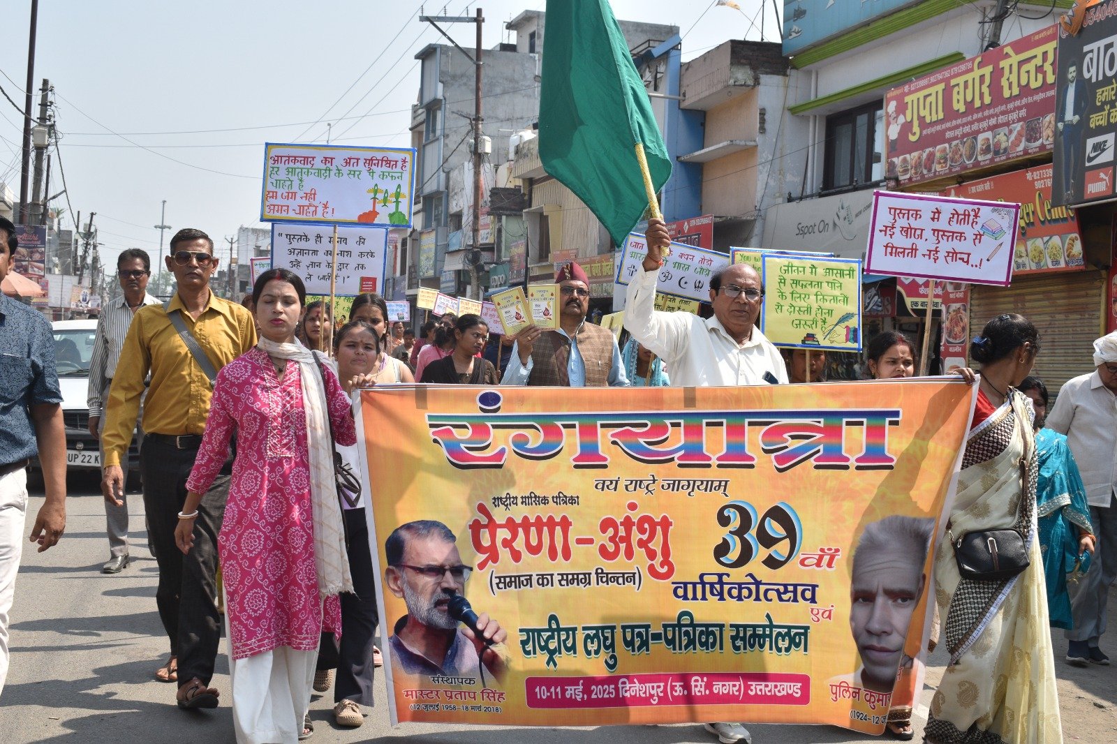 वरिष्ठ साहित्यकार हेतु भारद्वाज ने रंग यात्रा की शुरूआत हरी झंडी दिखा कर किया। रंगयात्रा में पढ़ने-लिखने की संस्कृति बहाल करने, नशा खत्म करने, समाज में अमन-चैन कायम रखने और पर्यावरण को बचाने के पोस्टरों के साथ सभी लोगों ने दिनेशपुर में स्वामी विवेकानंद, पुलिनबाबू और नेता जी सुभाष चंद्र बोस की प्रतिमा पर माल्यार्पण करके पूरे नगर की परिक्रमा की।