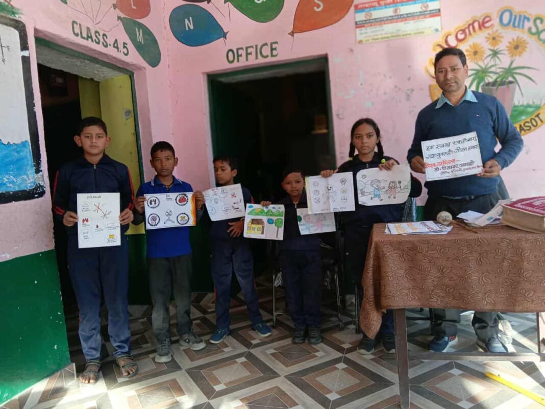 नशामुक्ति भारत अभियान की 5 वीं वर्षगाँठ पर राजकीय आदर्श प्राथमिक विद्यालय- बासोट, क्षेत्र- भिकियासैंण (अल्मोड़ा) के बच्चों द्वारा अपने जीवन में नशा न करने व नशे से दूर रहने का संकल्प लिया गया। नशे का शरीर पर पड़ने वाले दुष्प्रभाव पर बच्चों द्वारा निबंध, चित्रकला, पोस्टर , स्लोगन व भाषण प्रतियोगिता के माध्यम से अपनी अभिव्यक्ति दी गई । नशामुक्ति भारत अभियान के माध्यम से लोगों को विगत कई वर्षों से जागरुक कर रहे पिथौरागढ़ से डॉ. पीताम्बर अवस्थी (शैलेष मटियानी पुरस्कार प्राप्त शिक्षक) के नशा उन्मूलन के संबंध में किए गए कार्यों से बच्चों को अवगत कराया गया । चित्रकला के माध्यम से सोम्या, प्रिंस, रक्षिता, दीपक,आरुष, गीता कुमारी, भगीरथ ने नशे के दुष्प्रभाव को उकेरा। स्लोगन प्रतियोगिता में प्रिंस व भगीरथ ने भाग लिया । भाषण में दिव्यांशु, गायत्री,भगीऋथ ने अपनी बात रखी। निबंध प्रतियोगिता में रक्षिता व प्रिंस ने भाग लिया। सभी बच्चों ने नशामुक्ति कार्यक्रम में सक्रिय प्रतिभाग किया। इसके साथ ही हर्षित, आर्यन, मोहित,अक्षिता,दीपिका,करन,