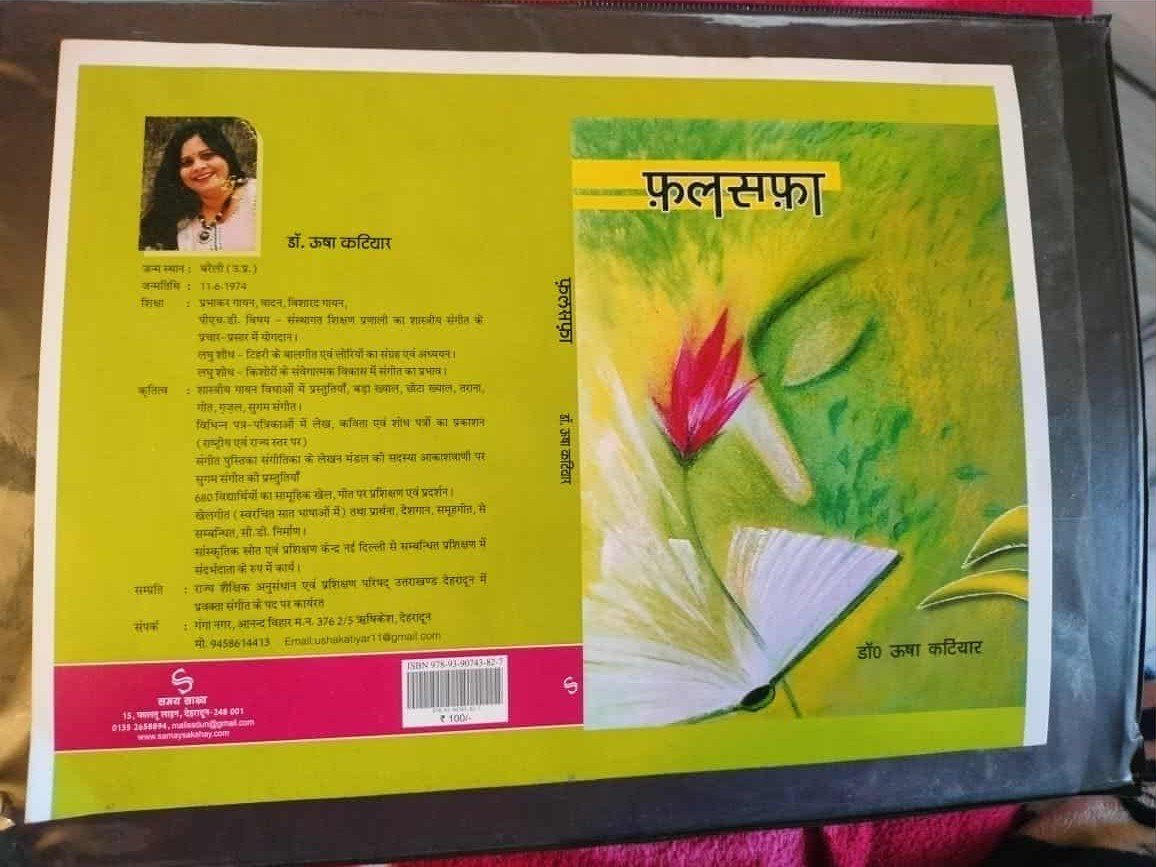 डॉ. ऊषा कटियार के काव्य संग्रह ‘फलसफा’ का लोकार्पण कल 23 नवंबर को किया जाएगा। लोकार्पण कार्यक्रम श्री साईं बाबा सुपर स्पिरिचूलिटी हॉस्पिटल ट्रस्ट ऋषिकेश में सम्पन्न होगा। कार्यक्रम के मुख्य अतिथि ट्रस्ट के सचिव सुभाष चंद्र शर्मा और विशिष्ट अतिथि ट्रस्ट की अध्यक्ष गीता माता होंगे.
