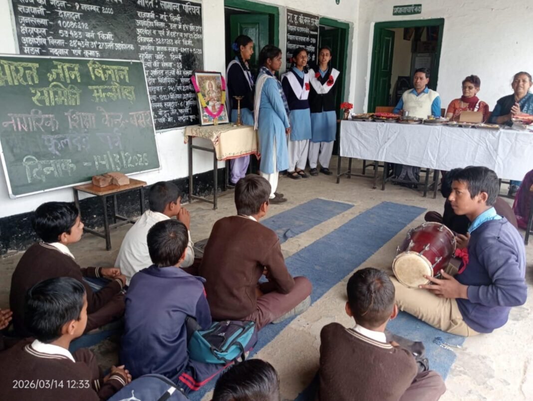 उत्तराखंड, अल्मोड़ा। भारत ज्ञान विज्ञान समिति अल्मोड़ा(उत्तराखंड) के तहत नागरिक शिक्षा केन्द्र – बसर ( हवालबाग) केन्द्र का उद्घाटन उत्तराखंड के लोकपर्व फूलदेई के पूर्व दिवस पर राजकीय इण्टर कालेज-बसर (हवालबाग) में माँ सरस्वती की प्रतिमा के सम्मुख भारत ज्ञान विज्ञान समिति के राज्य उपाध्यक्ष/जिलाध्यक्ष डॉ. विजया ढौढ़ियाल, जिला सचिव कृपाल सिंह शीला, समता सचिव भगवती गुसांई, विद्यालय की प्रधानाचार्या चन्द्रकला वर्मा द्वारा दीप प्रज्जवलन के साथ उद्घाटन किया गया। इसके उपरांत विद्यालय की बालिकाओं द्वारा मंचस्थ अतिथियों का बैज लगाकर स्वागत करने के साथ ही स्वागत गीत प्रस्तुत किया गया। इसी के साथ नवभारत साक्षरता कार्यक्रम “उल्लास” के तहत ग्राम- बसर व दरमाड़ की 11 महिलाओं को उल्लास के संबंध में दिशानिर्देशन व बातचीत के साथ उल्लास प्रवेशिका भी वितरित की गई। उत्तराखंड के लोकपर्व फूलदेई पर विस्तार से बात रखते हुए डॉ. विजया ढौढ़ियाल द्वारा इस लोकपर्व की वैज्ञानिकता के संबंध में बच्चों के बीच अपनी बात साझा की। समता सचिव भगवती गुसांई द्वारा लोकपर्व फूलदेई को हम अपने बचपन में कैसे मनाया करते थे,उस पर अपनी बात बच्चों के बीच साझा की। भारत ज्ञान विज्ञान समिति जिला सचिव कृपाल सिंह शीला ने अपने पारंपरिक त्योहारों को संरक्षित किये जाने पर जोर दिया। विद्यालय की प्रधानाचार्या चन्द्रकला वर्मा द्वारा सभी मंचस्थ अतिथियों का इस कार्यक्रम को सफल बनाने के लिए सभी का आभार व्यक्त किया। उन्होंने कहा कि लोकपर्व फूलदेई एक दिन का त्योहार न होकर वार्षिक त्योहार है। इसके साथ ही मंचस्थ अतिथियों व विद्यालय की बालिकाओं की उपस्थिति में समता स्मारिका – 2026 “हमारा कारवाँ” का विमोचन किया गया। इस अवसर पर विद्यालय के 30 परिवारों के बच्चों द्वारा ‘परिवार शैक्षिक सर्वेक्षण सूचना प्रपत्र भरे गये। जिसमें कक्षा -6 से 06,कक्षा-7 से 09, कक्षा – 8 से 11, कक्षा- 9 से 01, कक्षा-10 से 01, व कक्षा -11 से – 02 बच्चों द्वारा भरे प्रपत्रों से प्राप्त ऑकडो़ से दो परिवारों के बच्चों के माता- पिता निरक्षर पाये गये। सभी बच्चों से शपथ दिलाकर अपने परिवार के निरक्षर लोगों को साक्षर बनाने का निवेदन किया गया। विद्यालय की 10 बालिकाओं राशि भट्ट, पूजा जोशी, काजल आर्या, हर्षिता,विनीता तिवारी,रिया,बीना,भावना,योगिता काण्डपाल,दीया आर्या द्वारा उत्तराखंड के पारंपरिक परिधान के साथ फूलदेई की टोकरी तैयार की गई थी। इन सभी प्रतिभागियों को इनके द्वारा सजायी गयी फूलों की टोकरी पर जिला अध्यक्ष डॉ. विजया ढौढ़ियाल द्वारा पुरस्कृत किया गया। इस अवसर पर राजकीय प्राथमिक विद्यालय – बसर की प्रधानाध्यापिका हेमा लटवाल व रा.इ.का. – बसर से प्रवक्ता इतिहास ममता राना व स.अ. विज