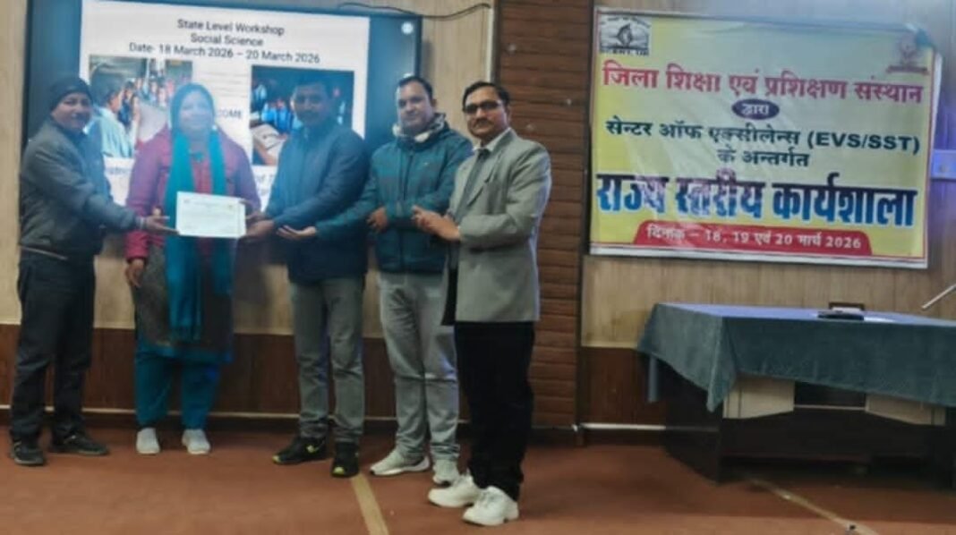 उत्तराखंड,चंपावत। डायट लोहाघाट(चम्पावत) में तीन दिवसीय राज्यस्तरीय सामाजिक विज्ञान कार्यशाला का समापन जिला पंचायत सदस्य प्रतिनिधि और समाजसेवी सचिन जोशी तथा प्राचार्य दिनेश सिंह खेतवाल ने किया। राज्यभर के शिक्षकों ने अपने जनपदों में किए गए नवाचारों को आपस में साझा किया। कार्यक्रम समन्वयक डॉ. अनिल कुमार मिश्रा ने उपस्थित शिक्षकों का आभार व्यक्त किया। जिला समन्वयक डॉ अनिल कुमार मिश्रा ने एनसीईआरटी की नई पाठ्यपुस्तकों की उपयोगिता पर विस्तारपूर्वक जानकारी दी। कार्यक्रम का संचालन जनपद सह समन्वयक प्रकाश चन्द्र उपाध्याय ने किया, जिन्होंने प्रशिक्षण की रूपरेखा प्रस्तुत करने के साथ ही शिक्षकों को नवाचारी पद्धतियों की ओर प्रेरित किया।